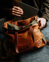 Rugzak die leer met bruin waxed-canvas combineert voor een stoere en stijlvolle uitstraling.